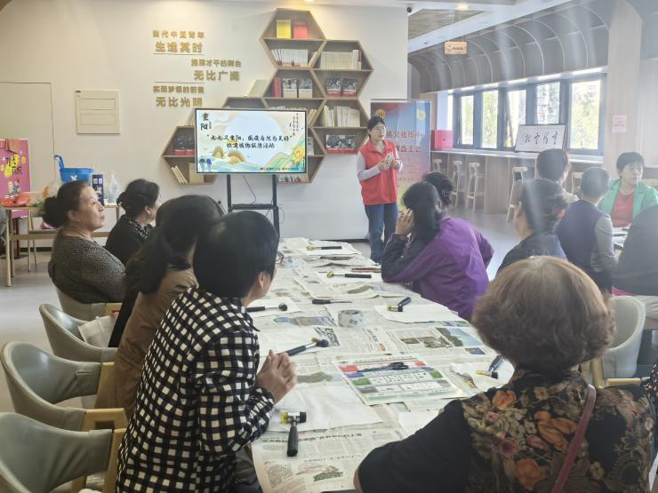 活动过程中,社区退休老年人表现出了极高的热情与创造力。她们或独自操作,或相互合作,不断尝试不同的植物搭配与敲打方式,力求创造出独一无二的拓染作品。现场氛围热烈而欢快,充满了艺术与创造的氛围。社工们耐心倾听老人提出的问题并予以回答,对于实践操作环节,老人操作不规范时社工主动帮忙纠正。经过初步的尝试,老人们纷纷交流经验与心得,分享哪种树叶好上色,哪个花瓣敲出来更好看,在原来的基础上再进一步丰富自己的构图。