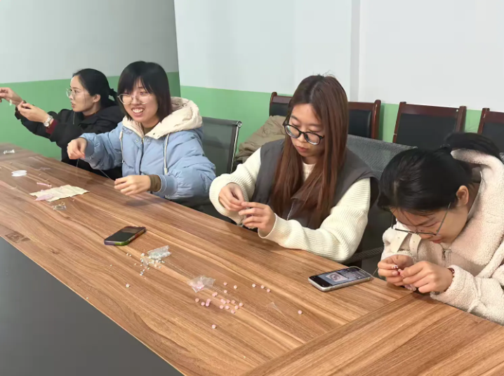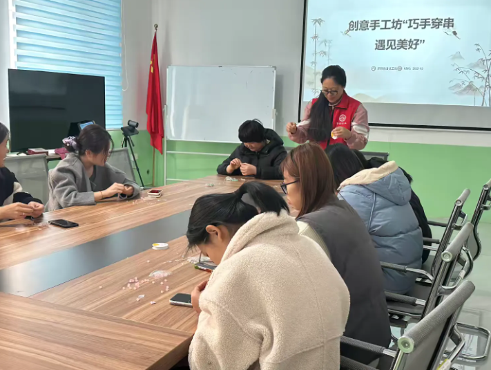 大家很快投入创作。有的女性专注于色彩搭配,挑选出清新淡雅或明艳热烈的珠子组合;有的则在造型上别出心裁,构思出花朵、动物等有趣图案。过程中,大家相互交流经验,分享创意,遇到困难时彼此鼓励、共同解决。