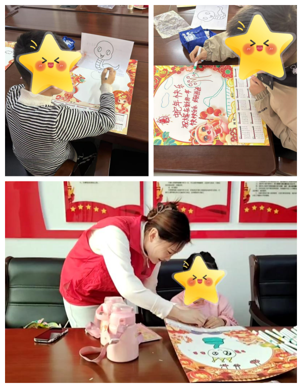 绘本故事结束后,孩子们最期待的创作时刻开始了。社工们为每位孩子准备了绘画材料和空白年历画纸。在社工的指导下,孩子们纷纷拿起画笔,绘制心中的蛇年形象。有的孩子画出了栩栩如生的蛇形图案,有的则用寓意吉祥的祝福语点缀画面。每一笔、每一划都凝聚着孩子们对新年的美好祝愿和对传统文化的热爱。在创作过程中,孩子们充分发挥了想象力和创造力,尝试了多种绘画技巧,并相互交流心得。社工们则在一旁耐心指导,鼓励他们大胆创新。