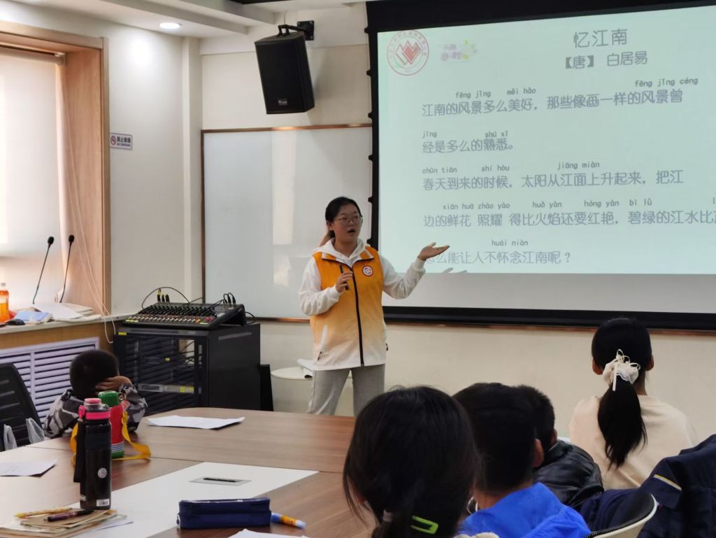 本期兴趣课堂上,《得以窥天光——从影视作品看中国文化》中,志愿者老师以影视作品《西游记》引入《小妖怪的夏天电影》,以小猪妖的故事片段,展示中国式家庭文化,引导组员树立良好的生活态度去面对自己的人生。《跳进诗词的旅游》中,志愿者老师以《忆江南》故事,讲述江南的美景、美食和文化,带孩子们深入了解江南的山川美景和民俗风情,感受祖国山河的魅力。