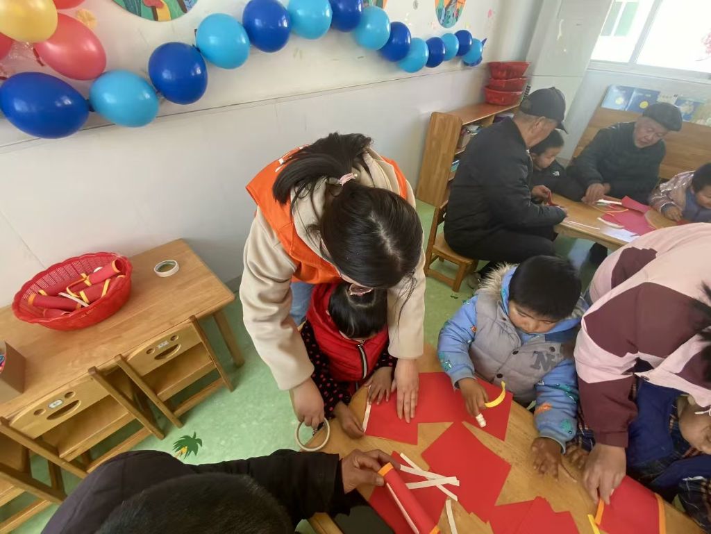 活动中,社工小付化身欢乐使者,带领孩子们制作精美的新年烟花,五色的折纸在孩子们的小手中舞动,寄托着美好的祝愿。