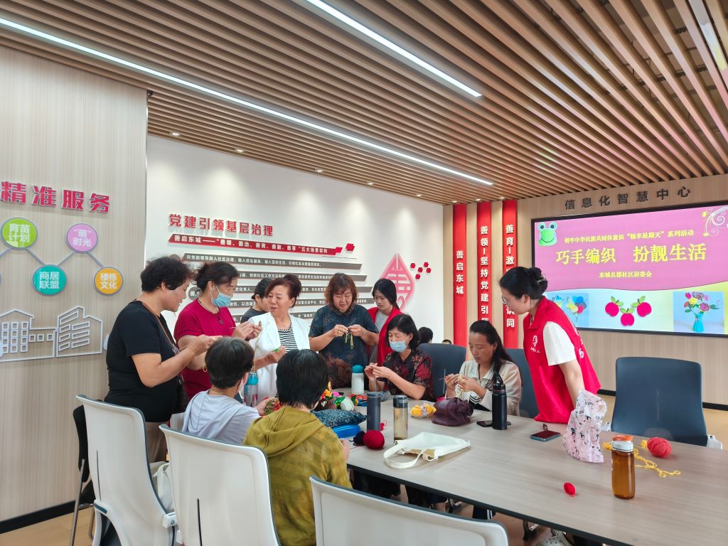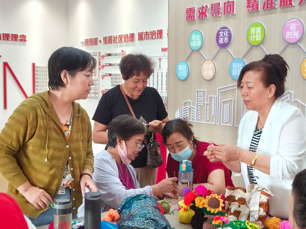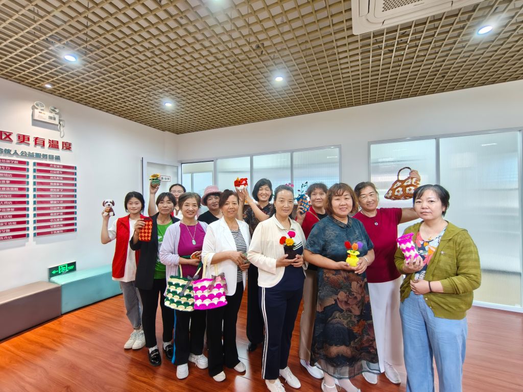 活动现场,社工通过破冰游戏“进化论”活跃氛围,并引导大家进行了自我介绍并完成了小组契约,很快组员们和志愿者老师熟悉起来。接着志愿者老师向大家展示了自己的作品,一件件精美的编织作品让在座的志愿者赞叹不已。于是,各位志愿者热情高涨,跃跃欲试。社工通过生动的讲解和演示,向参与者们介绍了钩织技艺的基本知识和操作方法。随后,经验丰富的志愿者钩织老师亲自上阵,耐心指导每一位居民如何正确持针、挂线、起头以及进行基础的钩织动作。在老师的悉心指导下,居民们纷纷拿起钩针和毛线,开始了他们的钩织之旅。有的居民是初学者,手法略显生疏,但在社工的鼓励和引导下,逐渐掌握了钩织的基本技巧;有的居民则已有一定的基础,他们不仅迅速完成了自己的作品,还主动帮助身边的同伴,分享自己的编织心得。“以后社区开展毛线钩织活动我们也可以教学了,又学会了一门新的技能,真棒!”组员刘阿姨开心地说。