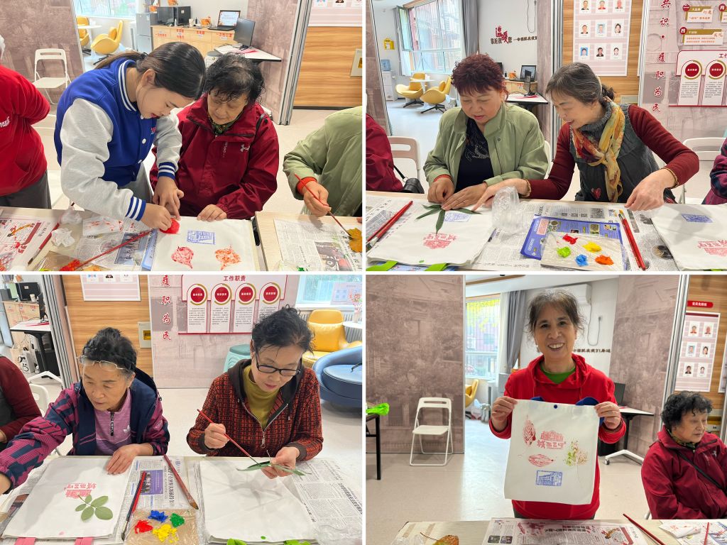 随后,社工拿出准备好的颜料和树叶,带领照护者们一起进行手工拓染帆布包制作。社工用亲切的话语和耐心的示范,引领老年照护者们踏入花草印染的奇妙世界。在实际操作环节,照护者们化身为充满灵感的艺术家,他们小心翼翼地拿起一片片形态各异的叶子,凭借着自己对美的理解和感悟,将花草精心地布置在白色的布包上,构成一幅幅独一无二的画。拓染过程中,他们专注而投入,手中的工具轻轻按压、滚动,将花草沾满颜料,均匀地印在布料上,大家不时地交流着生活中的经验,身心也得到了完全的放松。