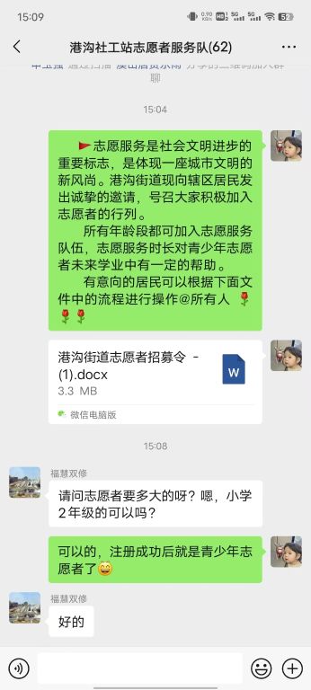 基层社会治理核心在于共治,社会工作者与志愿者作为社会基层服务的重要资源,在回应社会服务的需求方面发挥着重要作用。为进一步壮大港沟街道社工站志愿者队伍,为站点“‘微’赋能,筑‘港’梦”--志愿者孵化“阵地”打造注入新鲜血液,将志愿服务向专业化、精准化、定制化方向发力。9月17日,社工站展开“地毯式”志愿者招募活动,深入社区内部挖掘居民志愿者,鼓励大家积极参与社会事务,构建更加和谐的社会环境。