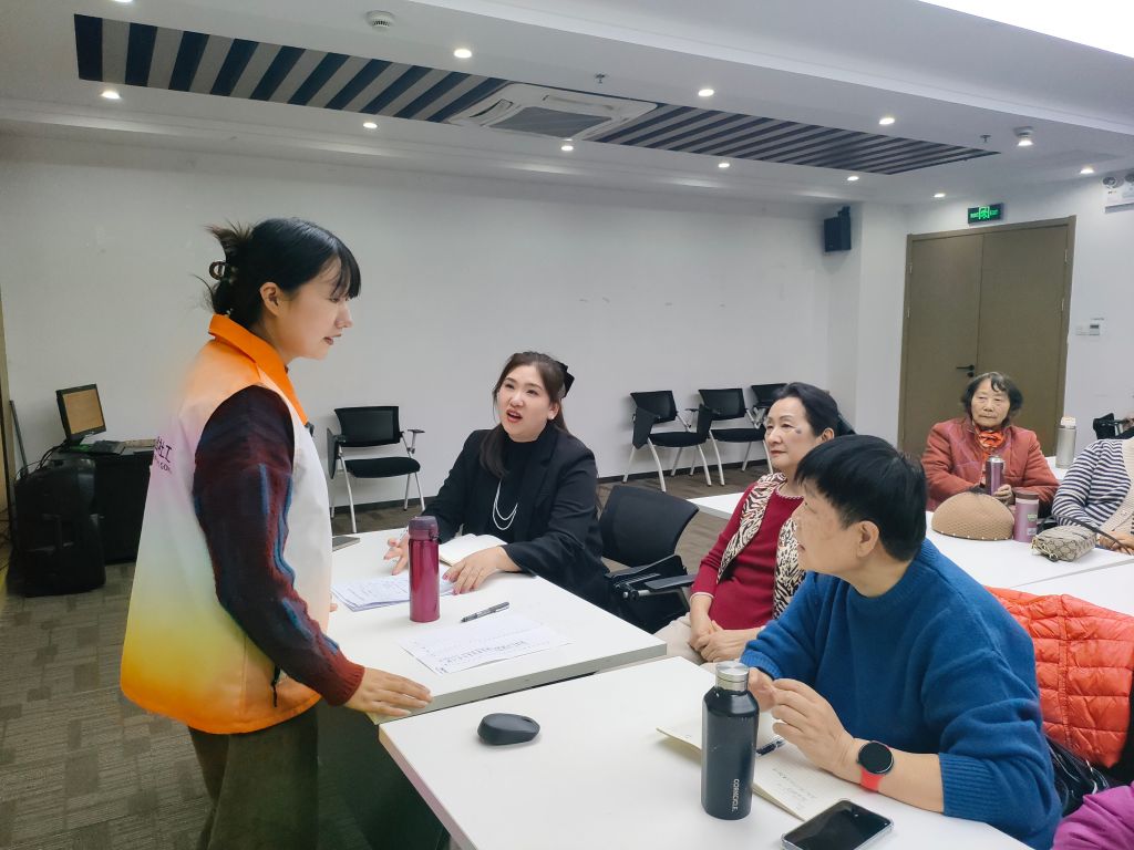 经验分享,暖人心扉。梁阿姨和郭阿姨作为代表积极分享志愿服务过程中的暖心故事与宝贵经验。在与服务对象的沟通中,她们运用培训中所学的访视服务技能,用心倾听服务对象心声,真诚关怀服务对象,将手指操带入服务对象家中,与服务对象一起通过手指操感受音乐的律动,服务对象脸上洋溢着幸福的微笑,紧紧拉着她们的手,这一刻让她们感受到了访视服务的意义。其他组织成员也积极回应,现场氛围活跃。