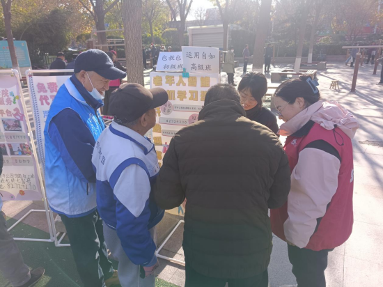 除了对手机班服务对象的招募,社工还对广场上活动的老年人进行了青合学院各个班级的宣传,老年人可以根据不同的爱好兴趣进行选择报名,通过班级授课制的学习,老年人可以发展不同的特长和技能,帮助老年人愉悦身心,促进老年人健康发展。