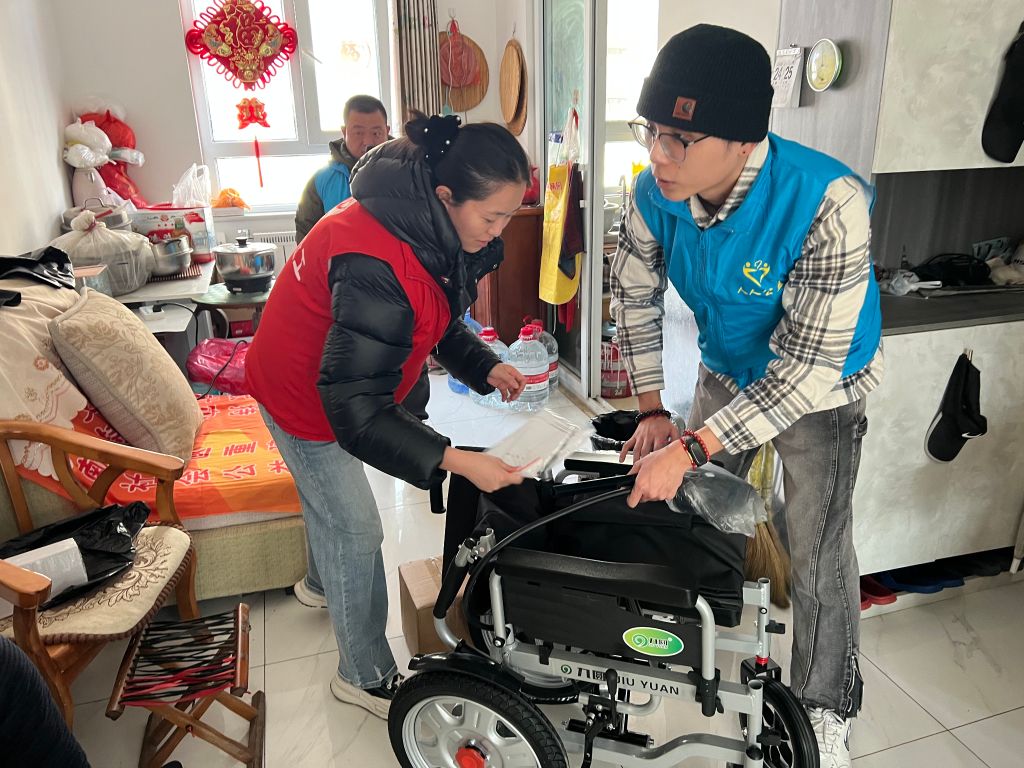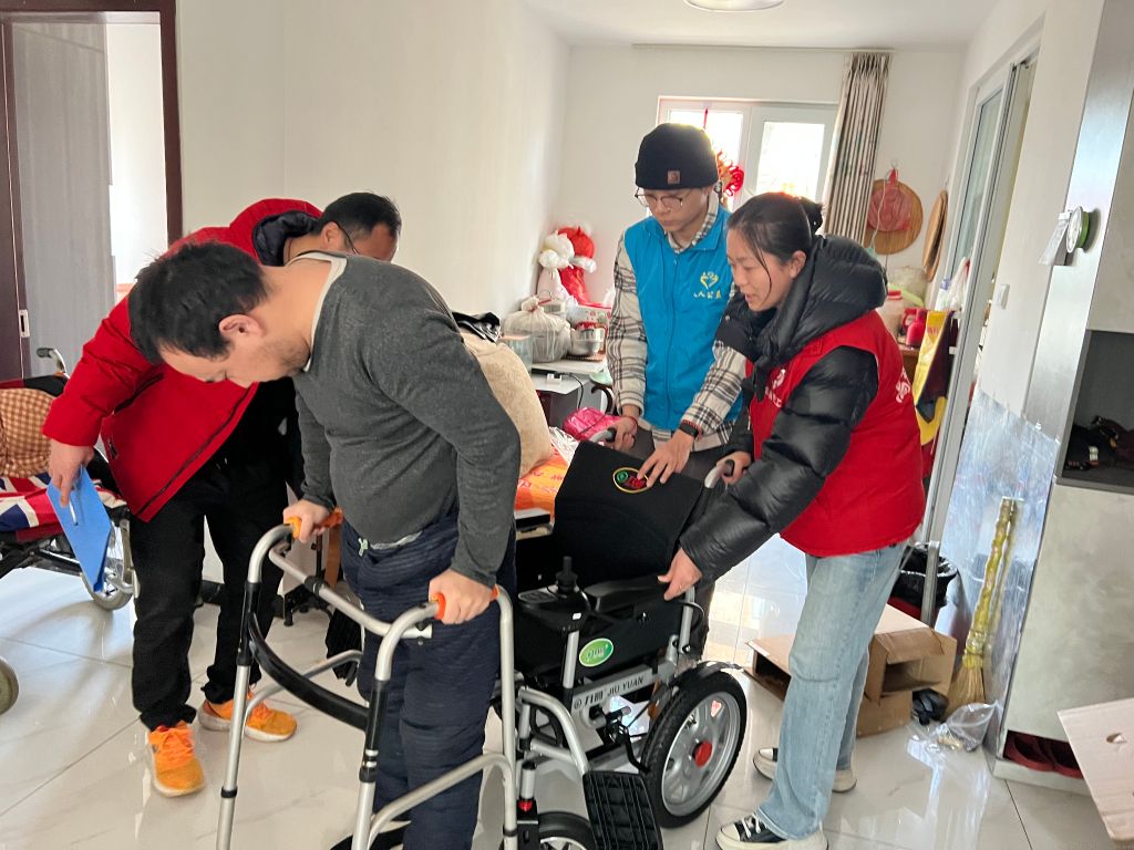 对于行动不便的残疾人,社工与志愿者帮助他们搬运辅具送入家门并为其安装。社工与残疾人进行面对面交流,了解他们的近期生活,关注他们身体健康状况,并做好详细记录,为后续精准帮扶收集信息。