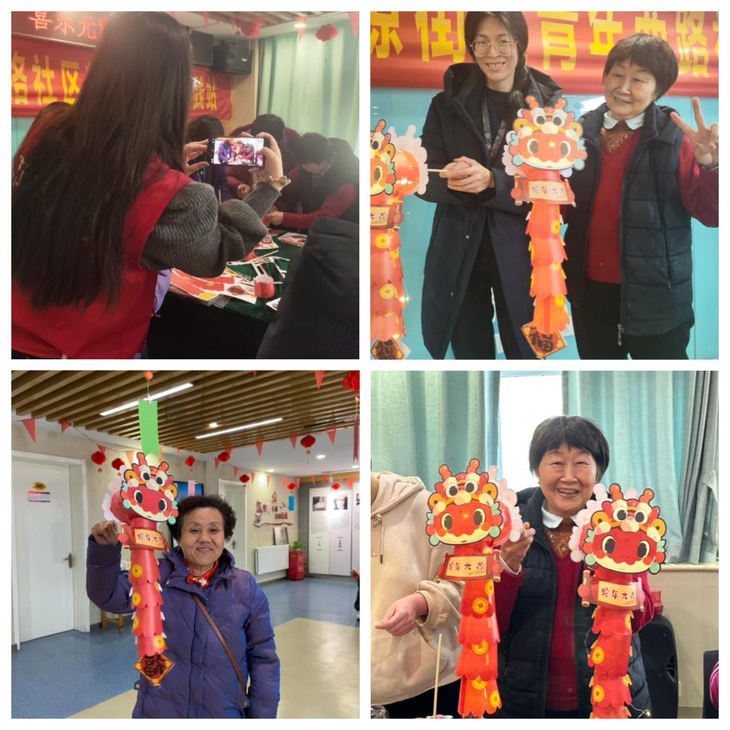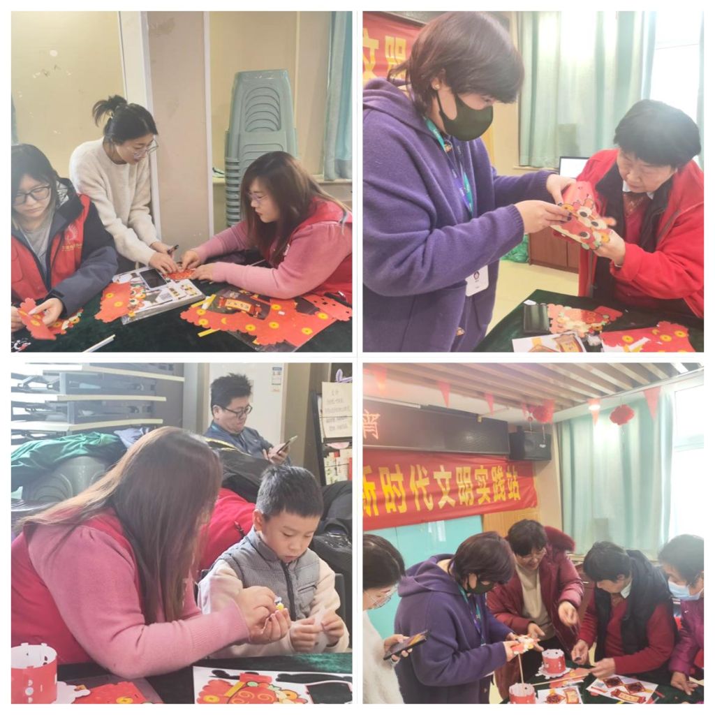 在社工的示范与指导下,居民们踊跃投身于花灯制作实践之中,他们细心摘下红纸、精心搭建灯笼骨架、细致缠绕彩绳,每一步都凝聚着对传统文化的尊重与热爱。社工与志愿者们在一旁提供适时的辅助与指导,促进了居民间的互动与交流,现场洋溢着和谐而温馨的氛围。