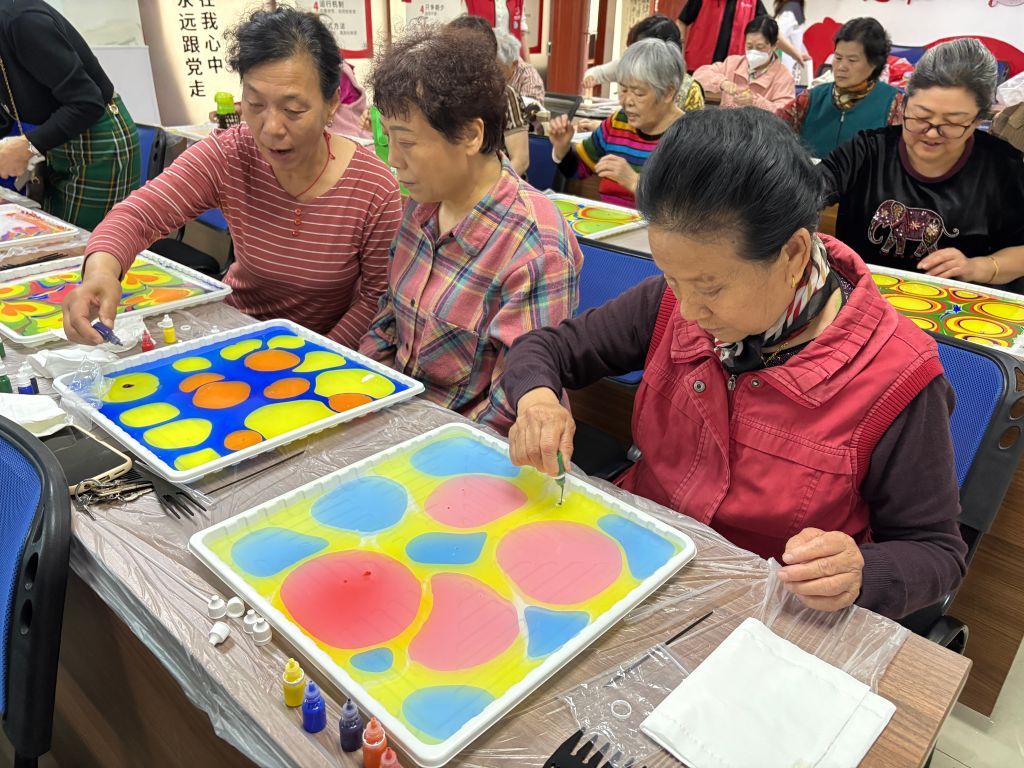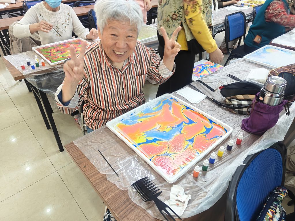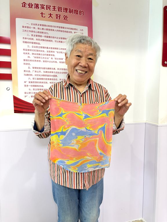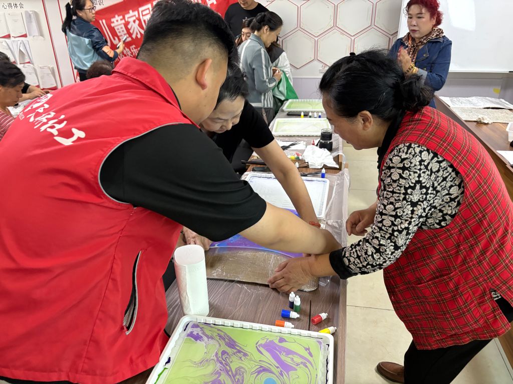 讲解结束后,终于到了大家期待已久的创作环节。居民们围在水盆旁,小心翼翼地将颜料滴入水面。刹那间,各种颜色在水面上迅速扩散、交融,形成了一幅幅绚丽多彩的抽象图案。有的像绽放的花朵,有的像飘逸的云朵,还有的像神秘的星系,每一种图案都充满了奇幻色彩。大家兴奋地展示着自己的作品,脸上洋溢着满满的成就感。这些丝巾不仅仅是简单的装饰品,更是大家用心创作的艺术品,承载着对生活的热爱和对美的追求。