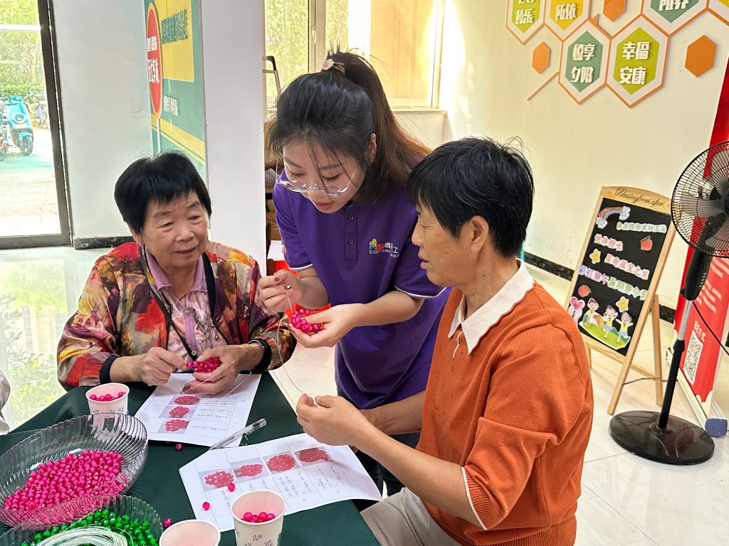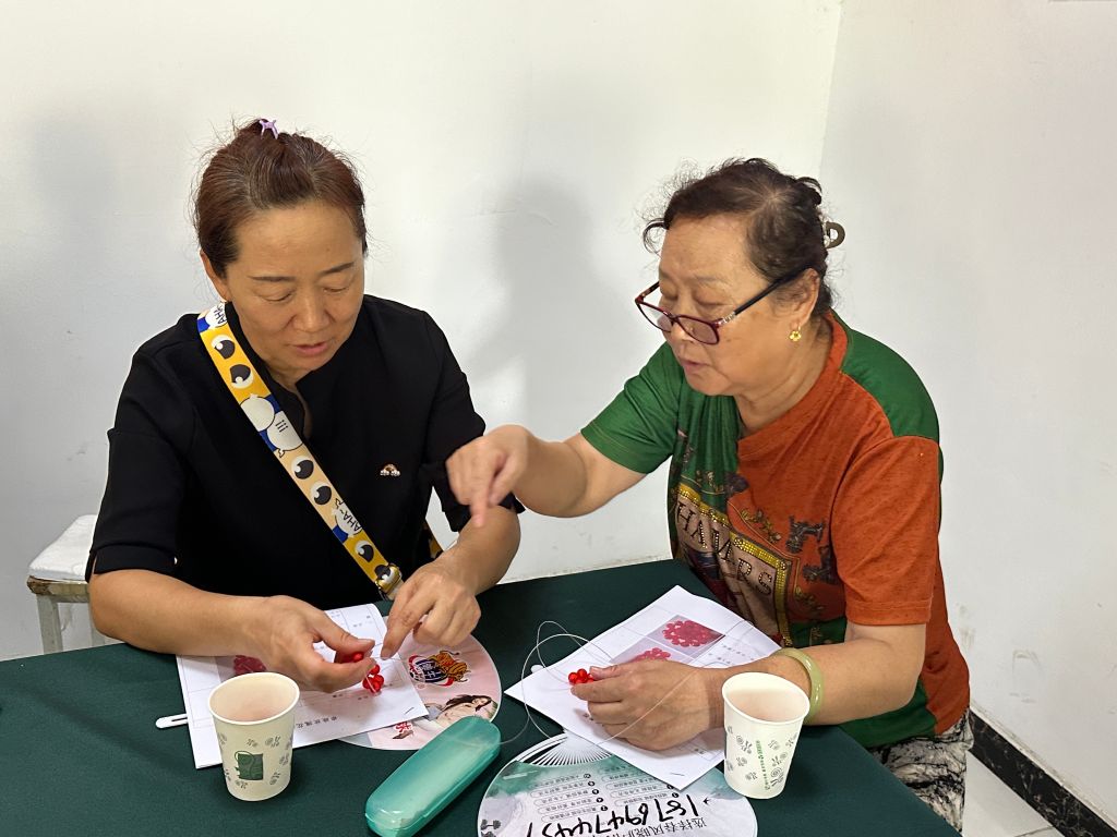 小组活动2-4节。在这3节小组活动中,社工专注于组员社交、学习、志愿等方面的培养。社交方面,社工采用分组讨论教学和组员一带一学习的方式,促进了组员之间的交流与沟通,分组讨论不仅增进了彼此的了解,还培养了团队合作精神,一带一教学让成员之间建立起了紧密联系。学习方面,社工教授串珠知识,让组员们有一技之长,同时,教授手指操、护眼操等保健操,让组员们学会了保健身体的方法。这些简单易学的健身操可以在日常生活中随时锻炼,有助于提高组员的身体素质。志愿方面,开展志愿服务培训,让组员们了解志愿服务的价值和意义,随后,通过将手工作品义卖,让组员们亲身感受志愿服务的过程。在这个过程中组员不仅帮助了困难群体,还实现了自我价值,收获了满满的成就感。
