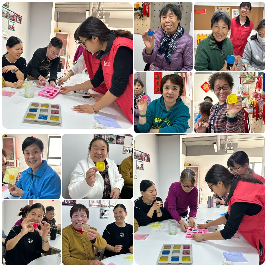 在这个过程中,居民们相互交流,分享着自己的生活故事和对色彩、香味的独特感悟。王阿姨感慨地说:“在调配这些颜色和香味的时候,我感觉自己好像回到了年轻的时候,那些美好的回忆都涌上心头。”社工们在一旁微笑着倾听,适时地给予指导和鼓励,整个空间充满了温暖与和谐的气息。居民们将调好色味的皂液倒入模具中,脱模的那一刻,居民们脸上绽放出的笑容,比阳光还要灿烂。他们手中拿着自己亲手制作的手工皂,就像捧着无比珍贵的宝贝。
