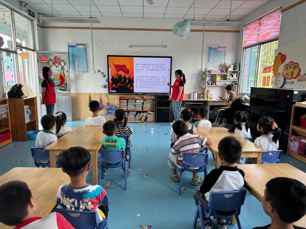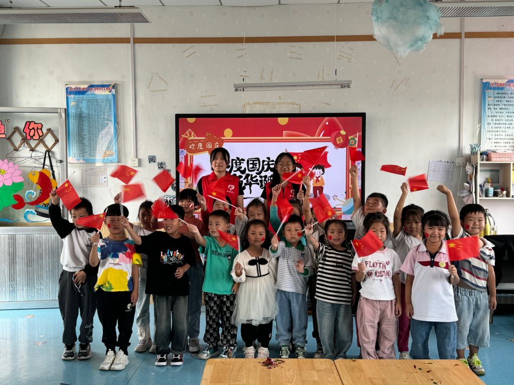 最后,儿童们歌唱祖国。每个人脸上的红色贴纸与手中挥动的五星国旗相映。儿童们唱着国歌,童声歌颂祖国,祝愿祖国繁荣昌盛!
