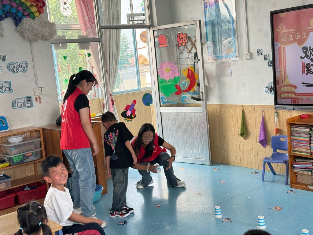 首先进行的是活动热身游戏——纸杯跳跳跳。孩子们围绕着固定的纸杯蹦跳,以不同的跳跃姿势锻炼儿童自身的下肢力量。此热身游戏不仅调动了儿童们参与的积极性,还拉近了社工与儿童们的距离。让他们在运动的乐趣中感受到即将到来的国庆节的气氛。