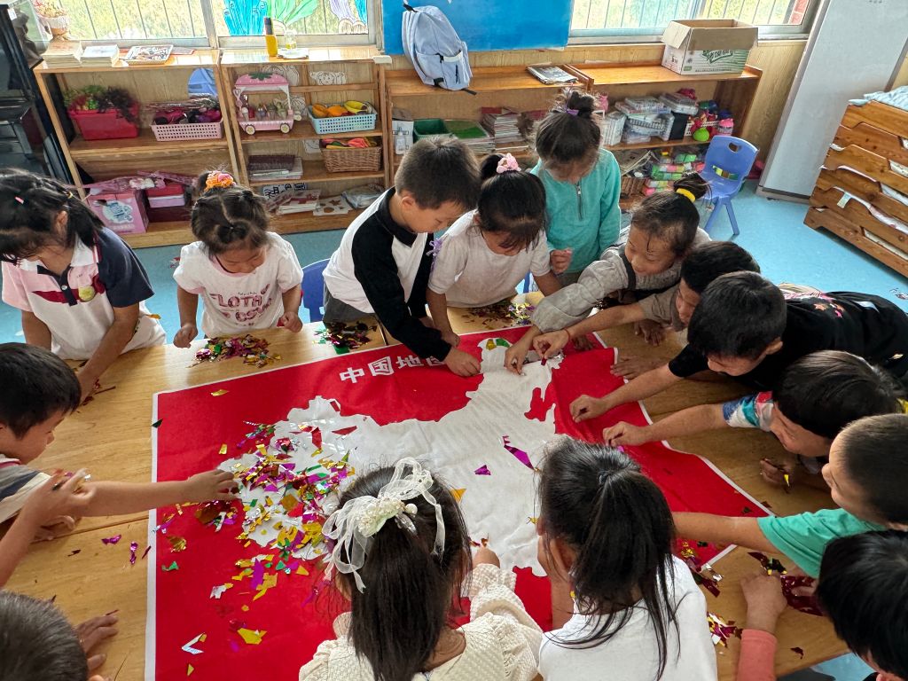 紧接着是手工活动——彩色中国图。此游戏培养儿童动手能力和团队合作能力,让他们在动手粘贴的同时感受到团队合作的乐趣。社工在协助儿童的同时,向他们叙述中国各地区的风土人情,让儿童们更深层次的感受到祖国的山河秀丽,繁荣昌盛。
