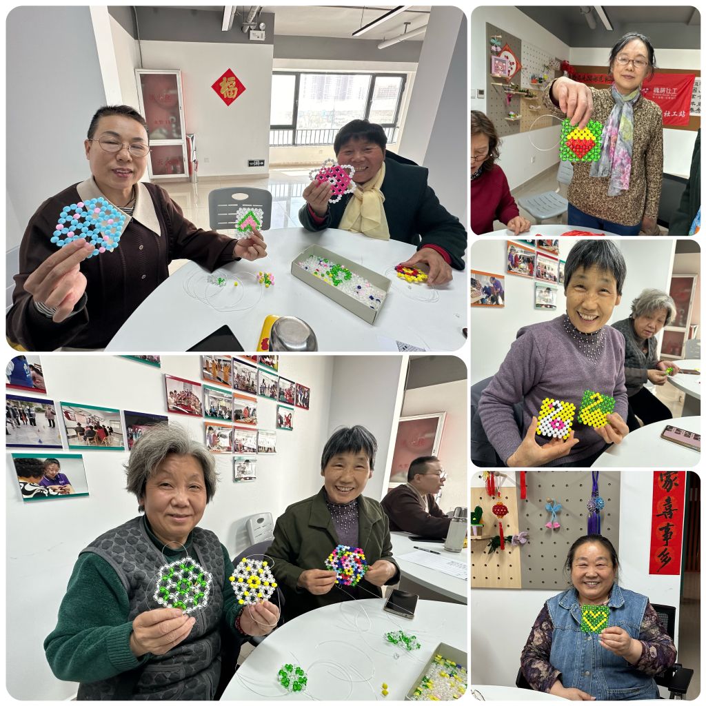 活动现场,五颜六色的珠子在老人们饱经岁月却灵巧依旧的手中翻滚,不一会儿,精致的杯垫雏形渐显。她们如今化身手工达人“老师”,指导居民穿针引线:“这珠子颜色搭配很重要,先串大颗的固定形状,线要绷紧些……”居民们围坐学习,欢声笑语回荡。原本内向的樊阿姨如今成了“孩子王”,她说:“以前我总是等别人关心,现在我也能给大伙带来快乐,这手艺传下去,让社工站的温暖一直流下去。”