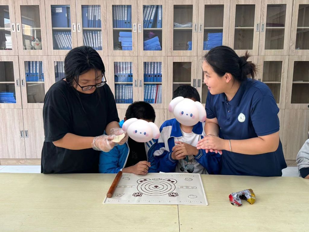 在社工和志愿者的示范和指导下,大家纷纷跃跃欲试,揉面、包馅、压模、成型,孩子们全神贯注地完成着每一道工序,一双双巧手于面团与馅料之间团动,不一会儿,一个个精巧玲珑的月饼便初现模样。大家相互学习、彼此帮助,分享着亲手制作的月饼。“快看,我这个月饼是小兔子形状的。”孩子们拿着自己的月饼给社工展示,社工及时给予肯定和鼓励,在轻松愉悦的氛围中,社工与情谊不断升温。