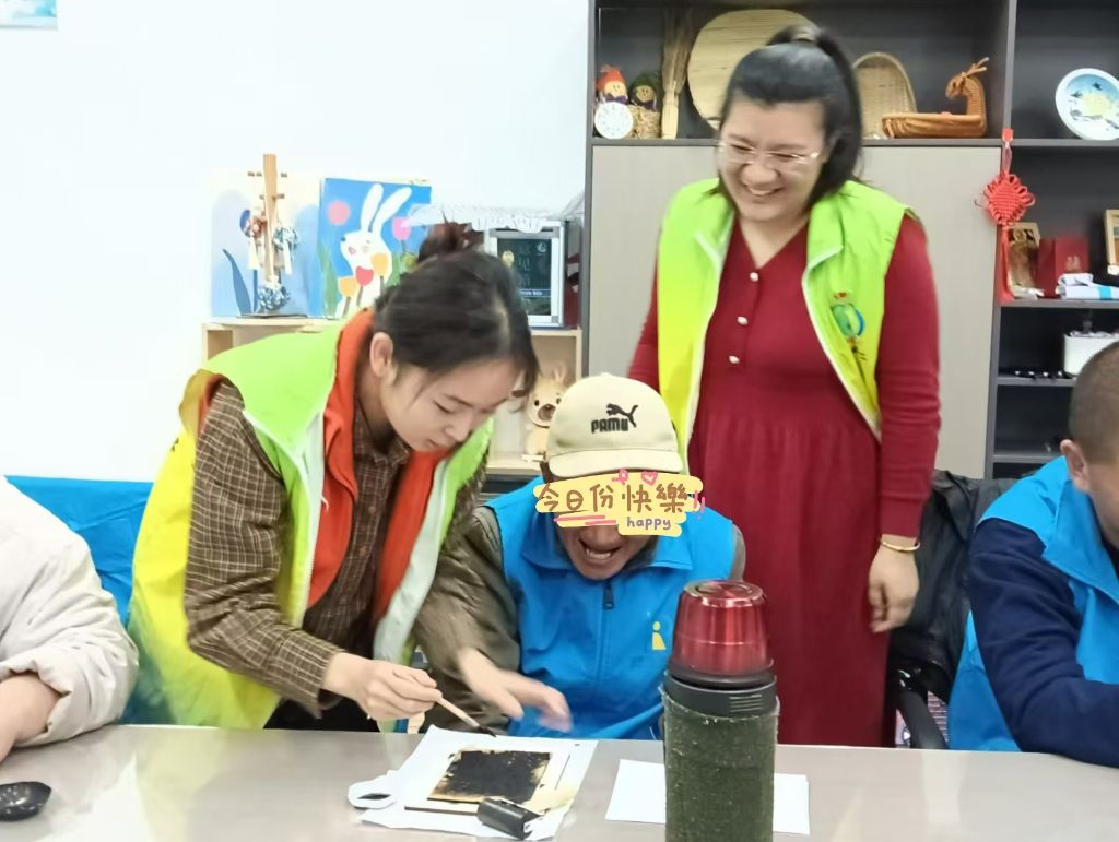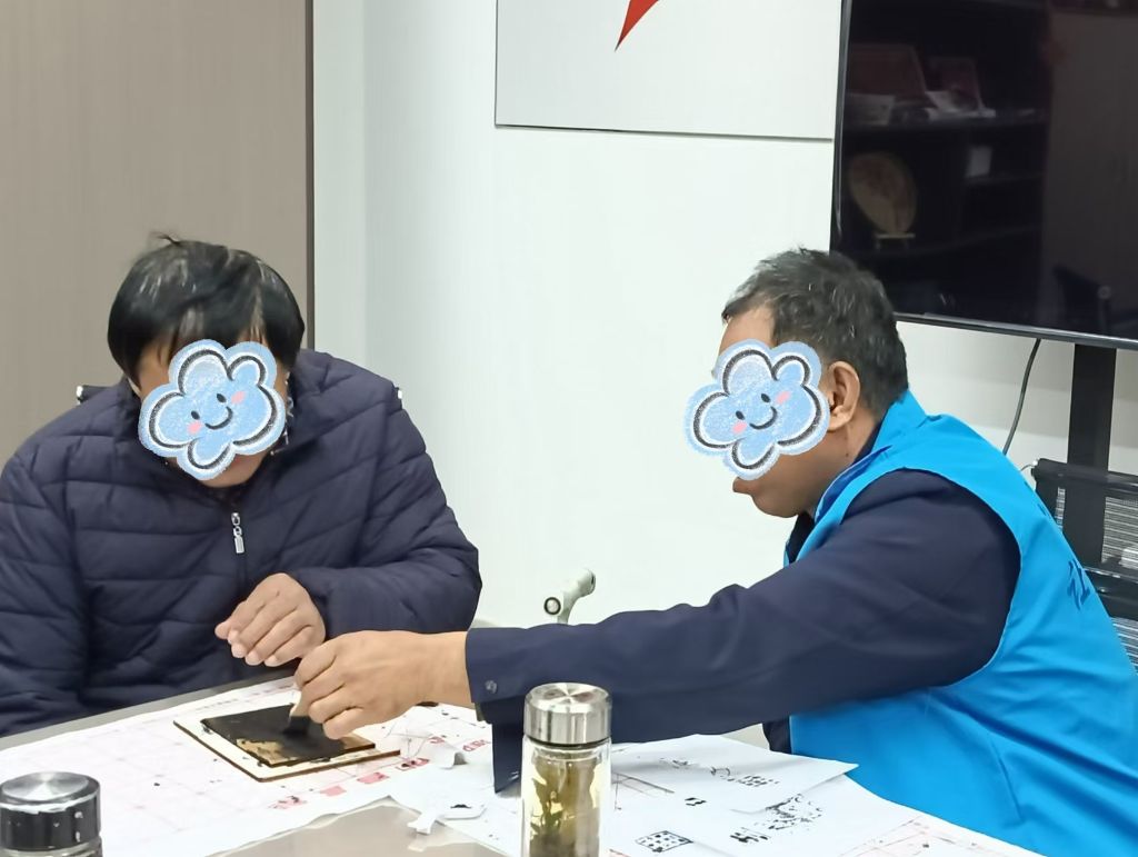 随后,在社工协助下,残疾人朋友纷纷拿起工具,亲身体验雕版印刷的奇妙乐趣。他们有的专注于涂抹墨汁,力求均匀饱满;有的小心翼翼地将纸张覆盖在刻板上,轻轻按压,生怕出现一丝褶皱;还有的在揭开纸张的瞬间,看到自己亲手印制出的精美作品,脸上洋溢出喜悦与自豪的笑容。尽管他们在操作过程中面临着各种挑战,但每一个人都全情投入,用自己的方式诠释着对非遗文化的热爱与尊重。