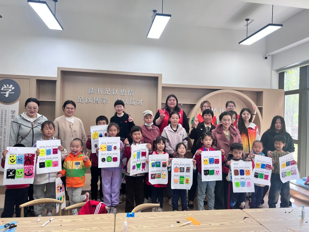 活动以“趣随乐舞”破冰小游戏为切入点,社工带着孩子们踩着欢快的鼓点,让现场气氛瞬间达到高潮,随后,志愿者带着孩子们共读《我的情绪小怪兽》绘本。通过“色彩情绪认知卡”帮助孩子将抽象情绪具象化,当读到“绿色代表平静”,社工组织家长与孩子同步学习“深呼吸平静法”,用肢体语言深入感受情绪状态。