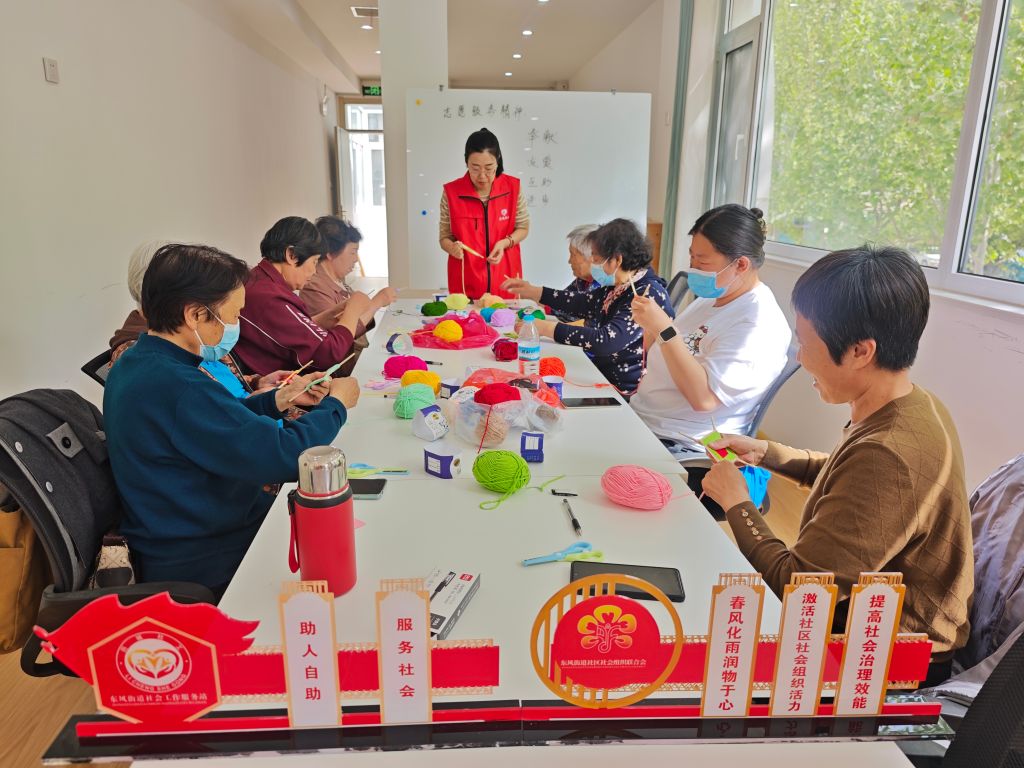 活动伊始,王阿姨身着鲜艳服饰,精神抖擞,手中的腰鼓在有力的敲击下发出清脆激昂的声响,明快的节奏、灵动的步伐,王阿姨以饱满的热情为现场带来了活力四射的开场表演。接着,手工老师凭借丰富的教学经验,耐心细致地为老人们讲解毛线挂件的制作步骤与技巧。从毛线的选择、缠绕,到框架的搭建,每一个环节都讲解得清晰明了。老人们围坐在一起,认真聆听,眼神中透露出对新知识和新技能的渴望。