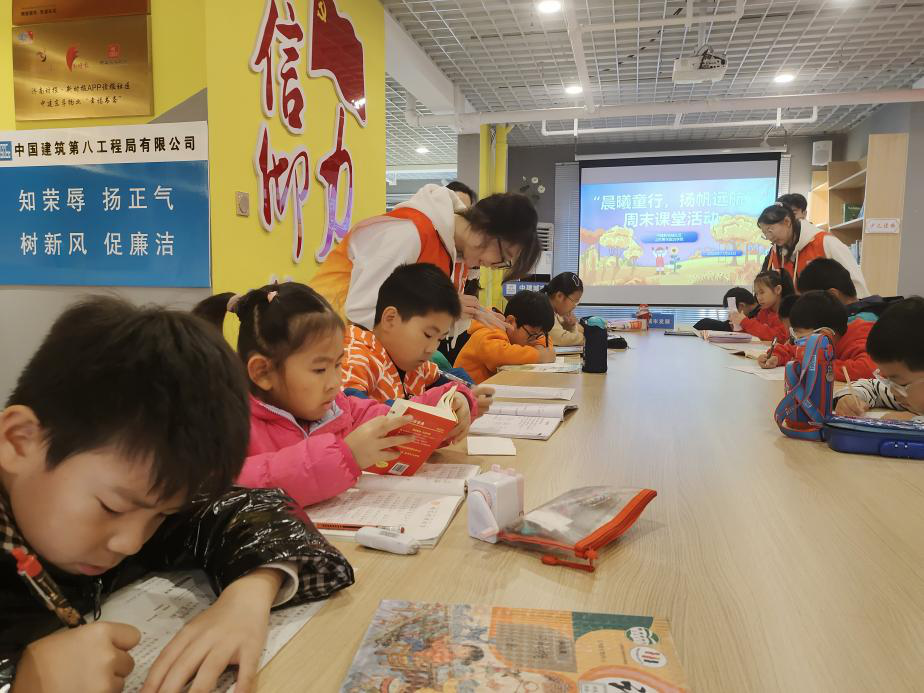 课业辅导环节,社工及志愿者引导儿童制定每日学习计划,并积极按照计划执行,每日完成计划后由各小组的伴读志愿者老师检查完成情况和正确率,帮助服务对象养成做事有计划和“当日事,当日毕”的良好学习习惯。儿童在学习过程中遇到疑难问题,社工和志愿者老师会给予针对性的指导,解决服务对象的学习难题。儿童作业完成之后,志愿者会耐心检查作业的正确情况,帮助孩子查漏补缺、提高学习效率。