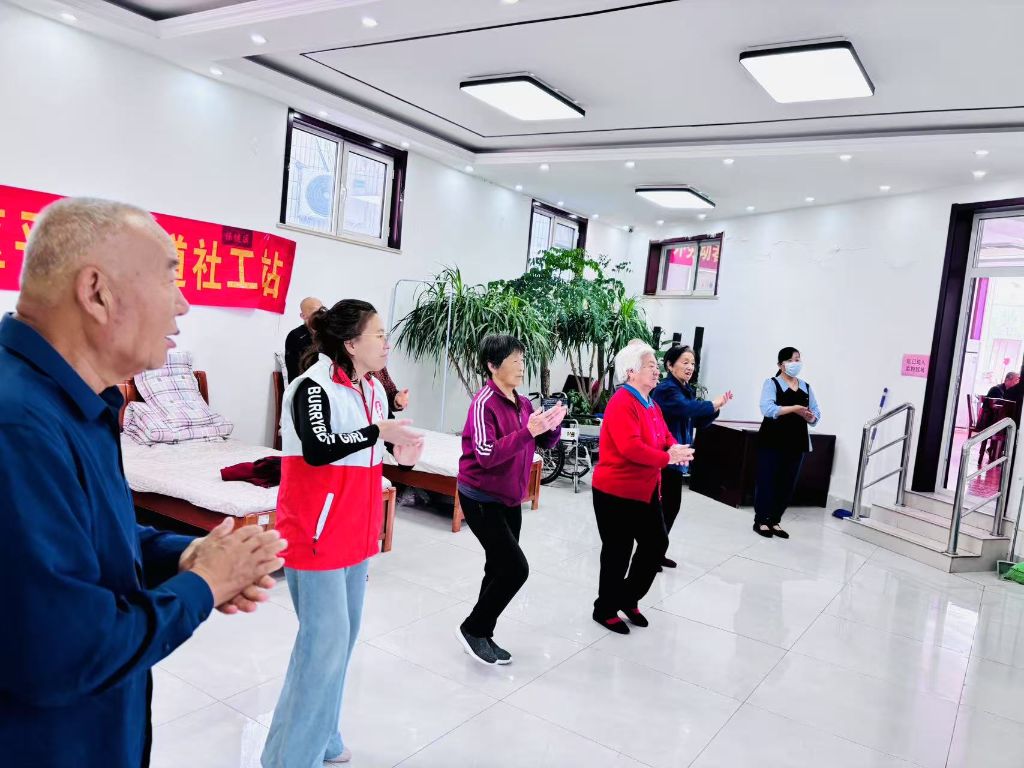活动开始前,社工们先带领老年人进行热身运动,随着轻快的音乐响起,社工耐心地示范着每一个动作,从伸展四肢到扭腰转体,鼓励大家循序渐进、量力而行。老人们热情高涨,认真跟学,虽然动作还稍显笨拙,但脸上都洋溢着欢快的笑容。