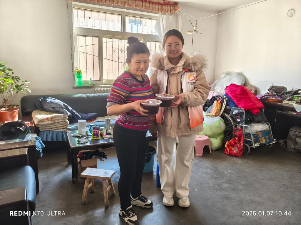 为落实社会救助、弘扬中华民族传统文化,进一步了解辖区内低保、残疾人的基本状况和服务需求2025年1月7日,姚家街道社工站链接山东右典健康产业有限公司,协同友谊苑社区组织开展了“浓情腊八,温暖送到家”腊八节入户探访活动