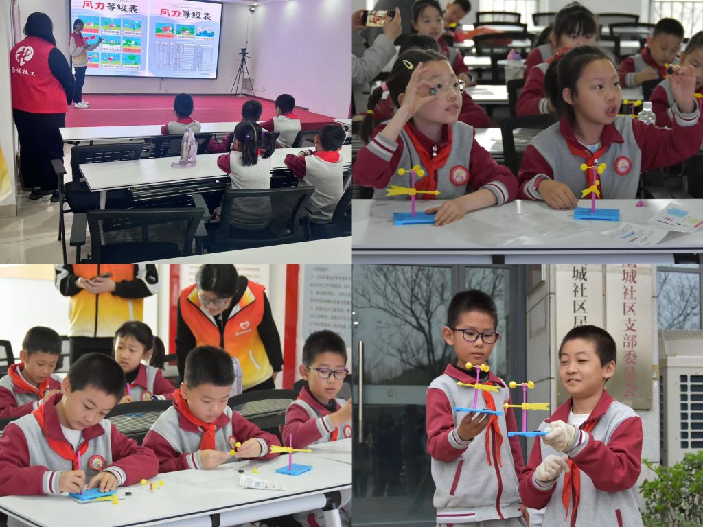 前期,社工站统筹策划了阶梯式成长课程。首先,在气象知识讲座环节由高校志愿者团队通过生动的图片、精彩的视频和通俗易懂的语言,为同学们揭开了气象世界的神秘面纱。从常见的阴晴雨雪,到复杂的台风、寒潮,趣味的讲解实现了知识传递与兴趣激发的双重目标。在手工实践环节,社工设计风向标制作课程,并组织同学们在风中感受风向和风力的变化。