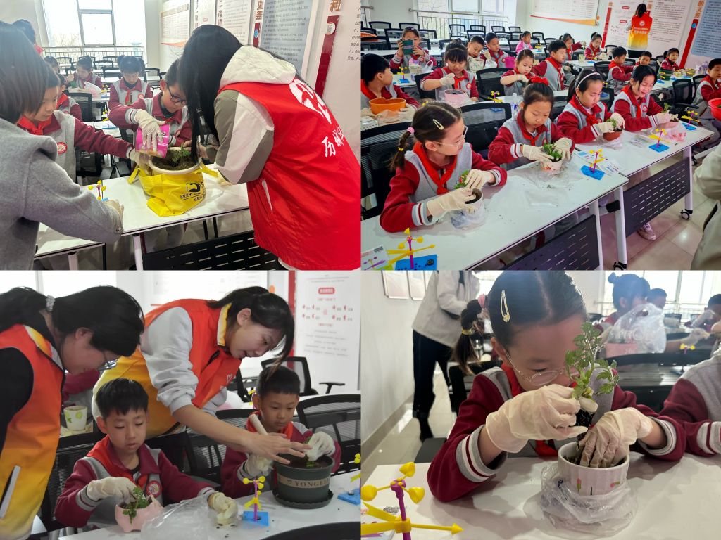 在番茄苗种植环节,社工指导学生手持小铲子,将番茄苗种进花盆,并动员同学们要建立植物成长观察日志。
