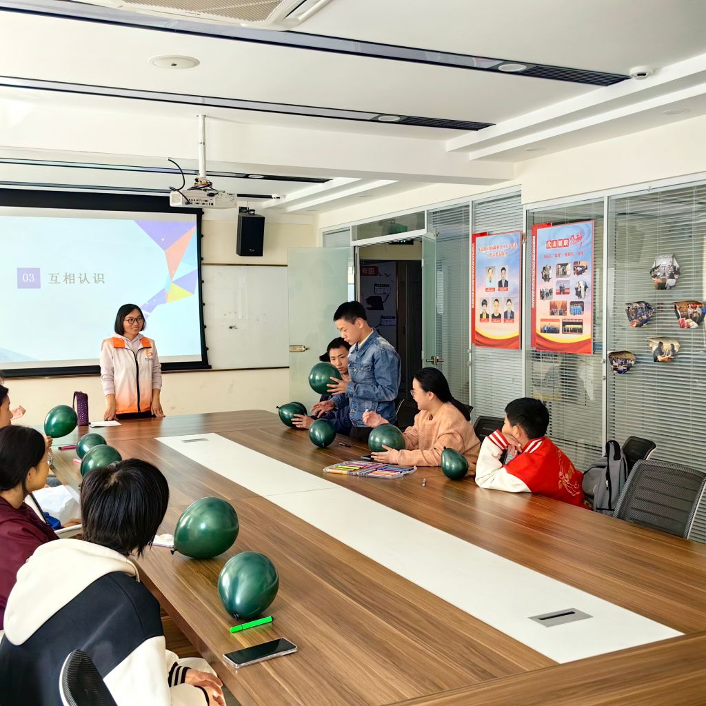 活动伊始,驻站社工以“成长护照”的创新形式,将活动日程转化为趣味盎然的探索任务卡,通过“时光坐标轴”可视化呈现活动脉络,让青少年在具象化的认知中建立起对成长营的立体期待。随后开展的“气球传情”破冰行动,将传统自我介绍升华为艺术创作——每个彩色气球承载着少年们的个性标签,在欢快的传递中编织成绚丽的社交网络,志愿者与青少年间的距离在跃动的色彩中悄然消融。在“公约共创”环节,社工引导青少年以圆桌讨论的形式集思广益。经过层层梳理,最终诞生的不仅是规范条文,更是少年们许下的承诺。