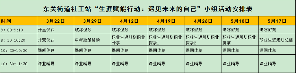 为满足辖区儿童青少年对中考升学和未来职业规划的需求,助力他们踏上逐梦之路,东关街道社工站精心策划了“生涯赋能行动:遇见未来的自己”公益成长计划。该计划自3月22日启动,持续至5月17日,共开展7次活动,通过构建“政策解码——榜样引领——职场启蒙”的成长矩阵,以系统化的生涯教育为辖区儿童青少年铺就从学业规划到职业探索的成长通途。
