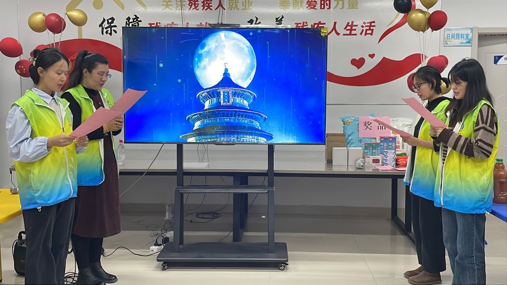社工们集体朗诵的《月光下的中国》声情并茂,用深情的语调勾勒出祖国的壮丽山河与悠久历史,引发全场共鸣。古筝演奏《我和你》如行云流水,弦音袅袅,营造出宁静而美好的意境。最后,如康学员与社工共同唱响《我的祖国》,激昂的歌声饱含对祖国的赞美与祝福,将现场气氛推向高潮,彰显了残疾朋友积极向上的精神风貌与爱国情怀。