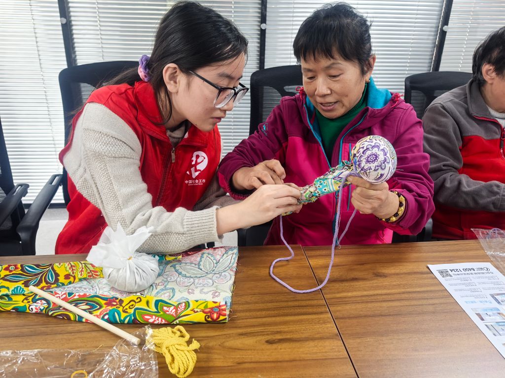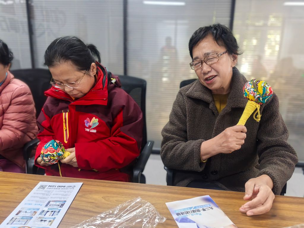 养生锤 DIY 环节同样受到了老人们的热烈回应,老人们在志愿者的耐心指导下,亲手制作属于自己的养生锤。他们挑选着自己喜欢的布料和装饰,在社工的帮助下认真地制作,绕线……这个过程不仅让老人们锻炼了动手能力,更让他们感受到了创造的乐趣。活动现场张奶奶拿着自己制作完成的养生锤,开心地说:“这个养生锤是我自己做的,以后可以用来捶捶背,很实用。”