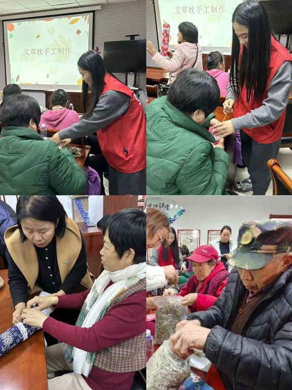 活动伊始,社工首先向大家讲解了艾草的功效与保健作用。艾草,作为一种传统的中药材,具有温经散寒、助眠安神的功效。在快节奏的现代生活中,许多老年人面临着睡眠质量下降的问题,艾草枕作为一种自然疗法,能够帮助改善睡眠,可有效增强机体免疫力。
