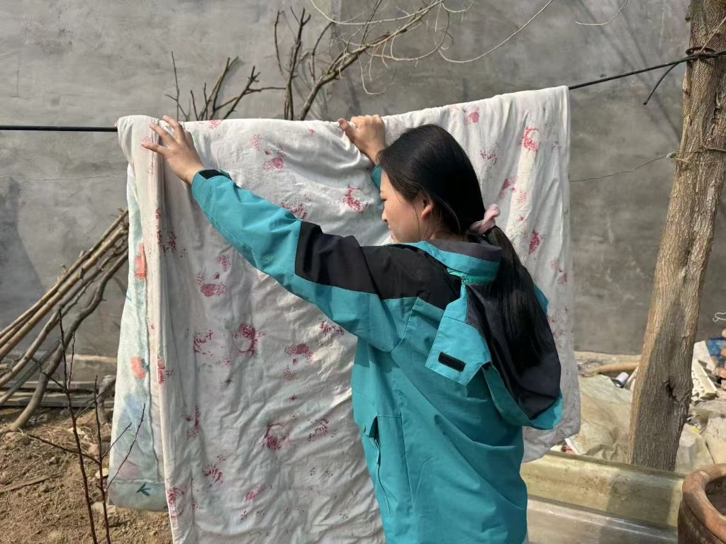 尹大娘今年80岁,独自一人居住,腿脚不便。看到社工们的到来,王大娘高兴得合不拢嘴。社工陪着王大娘聊天,听她讲述过去的故事,房间里充满了欢声笑语。阳光正好,社工决定帮王大娘晒晒被子。大家分工合作,有的擦晾衣绳,有的把被子抱到院子里,尹大娘看着社工们忙碌的身影,眼里泛着泪光,连声道谢。尹大娘拉着社工的手说:“这条胡同都没有说话的人,你们来了我可高兴了!”社工们也答应大娘定期来走访,还鼓励尹大娘在天气好的时候出门走走,多参与社交,结识新朋友。