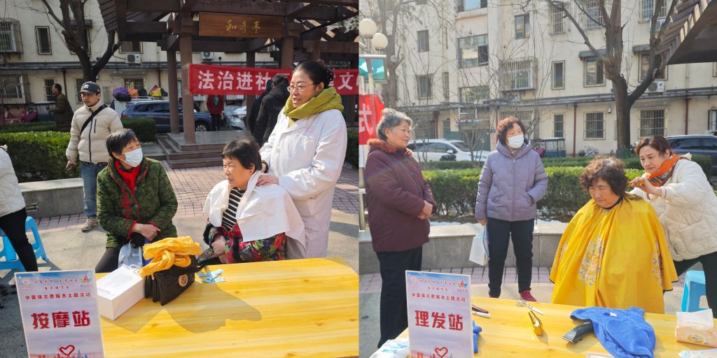 理发角温馨满满,理发师志愿者在社工组织下为居民理发,大家唠着家常等候,理完发容光焕发,李大妈夸赞:“免费理发能唠嗑,社区生活更有味,是雷锋精神。”相邻按摩角人气旺,专业按摩志愿者在社工协调下,为居民舒缓疲惫,手法娴熟地按摩肩颈、腰部。社工准备用品、询问感受。