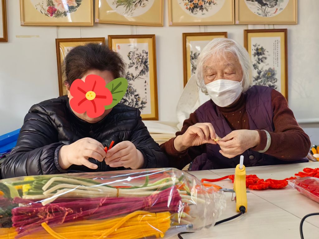 随着游戏的结束,活动进行到制作扭扭棒花束的环节。社工首先进行了“牡丹花”的详细的讲解与示范,一边讲解制作技巧,一边亲手演示制作流程。在组员制作“牡丹花”的过程中,动手和理解能力较强的组员们在看到身边的组员制作速度缓慢、未完成花朵制作的情况下,主动伸出了援助之手,“来,我们一起完成花瓣的制作,我们是一个集体,要互帮互助”组员尚阿姨说道。时间飞逝,一朵朵火红的牡丹在一双双巧手下绽放,组员之间的友谊在大家的互帮互助下更加深厚。