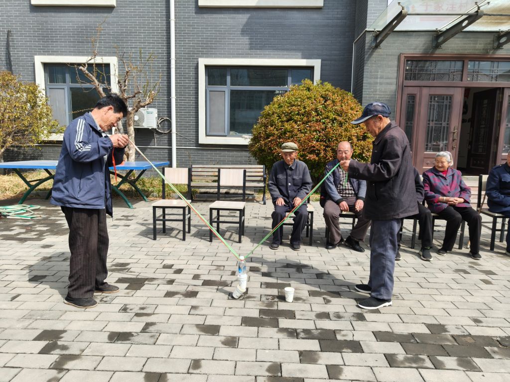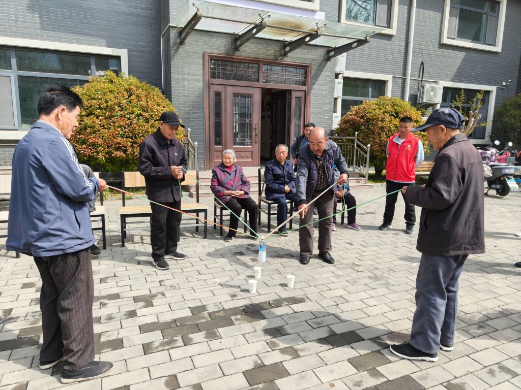 活动当日,于家洼幸福院热闹非凡,老人们怀着期待的心情早早地来到了现场。社工热情地迎接每一位老人,并引导他们就座。游戏正式开始,一位老人率先单独尝试。只见他全神贯注,小心翼翼地控制着绳子,轻松地将杯子放入了指定位置,现场响起了热烈的掌声。这一简单的尝试让老人们信心大增,也为后续的团队协作奠定了良好的基础。随着难度的逐渐增加,游戏进入了两人、四人乃至八人共同协作的阶段。当绳子数量增多,杯子变得摇摇晃晃时,老人们面临了更大的挑战。然而,他们并没有退缩,而是相互配合、相互鼓励。有的老人负责指挥方向,“左边再拉一点”“慢一点,稳住”,在大家的共同努力下,杯子终于平稳地落入了指定位置。那一刻,老人们欢呼雀跃,脸上洋溢着自豪和喜悦的笑容。