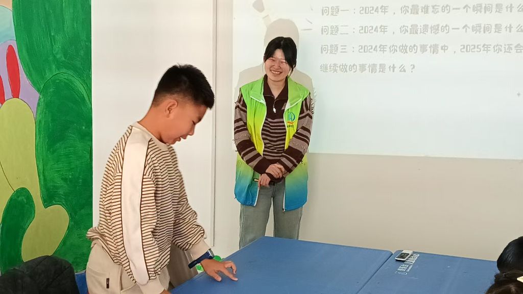 随后,活动进入了温馨的分享环节。社工引导孩子们思考三个深刻的问题:“2024年,你最难忘的一个瞬间是什么?”“2024年,你最遗憾的一个瞬间是什么?”“2024年你做的事情中,2025年你还会继续做的事情是什么?”孩子们在社工的带领下分组展开了热烈的讨论,现场气氛活跃,大家纷纷分享了自己在2024年的难忘经历、遗憾时刻以及对新一年的展望。有的孩子讲述了在学校取得优异成绩时的喜悦,有的孩子则提到了与家人朋友共度的欢乐时光,还有的孩子勇敢地说出了自己未达成目标的遗憾,并坚定地表示在2025年要继续努力。在分享过程中,孩子们不仅增进了彼此之间的了解,更学会了倾听与表达,提升了沟通交流能力。
