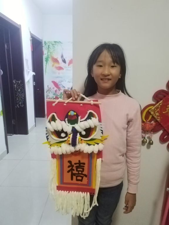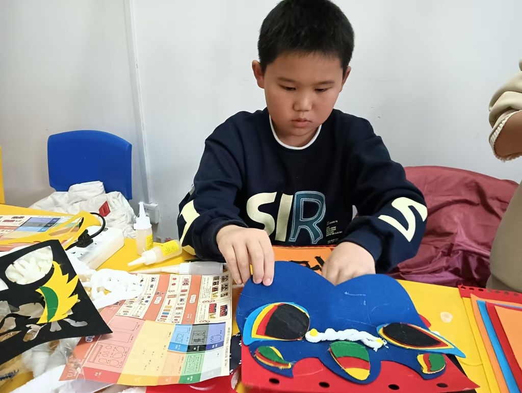 最后,社工带领孩子们一起制作醒狮挂毯,将传统文化元素融入其中。社工详细讲解了制作步骤和技巧,孩子们充分发挥自己的想象力和创造力,亲自动手操作,感受着传统文化的魅力。醒狮挂毯制作完成后,孩子们手持自己的作品合影留念,脸上洋溢着自豪与喜悦。