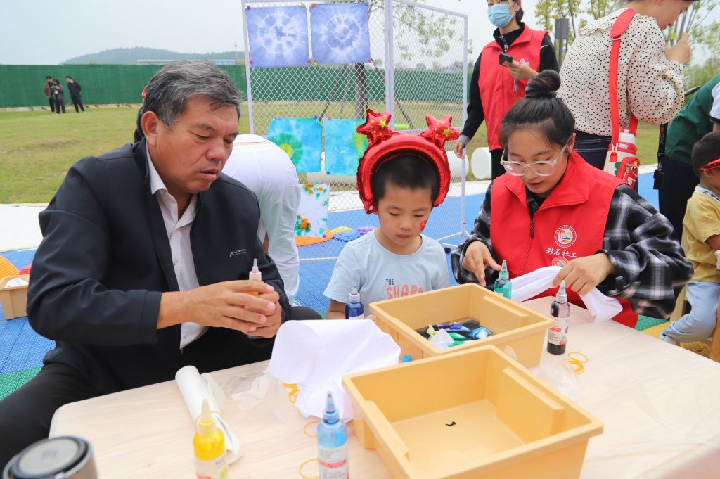随后,社工带领大家走进扎染的世界。扎染,这一古老的民间传统染色工艺,以其独特的魅力吸引无数人的目光。在社工的指导下,孩子们利用颜料、丝巾、麻绳等工具,亲手体验了扎染的乐趣。他们或扎紧、或松开,每一块布料都承载着孩子们的奇思妙想。当解开麻绳的那一刻,绚丽多变的扎染作品呈现在大家眼前,孩子们的脸上洋溢着满足和喜悦的笑容。