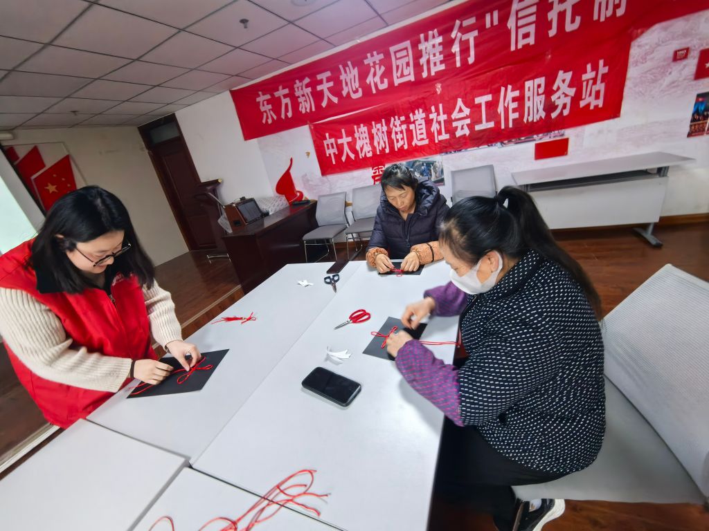 为丰富本节活动的内容,增强组员参加活动的积极性。临近岁末,中大槐树街道社工站开展了“结”伴同行 “窗”间藏福为主题的认知症预防小组活动,我们把“年味”融入到了本次小组活动的内容之中,组员们学习编制中国结、剪窗花,成为了本节活动的一个亮点。