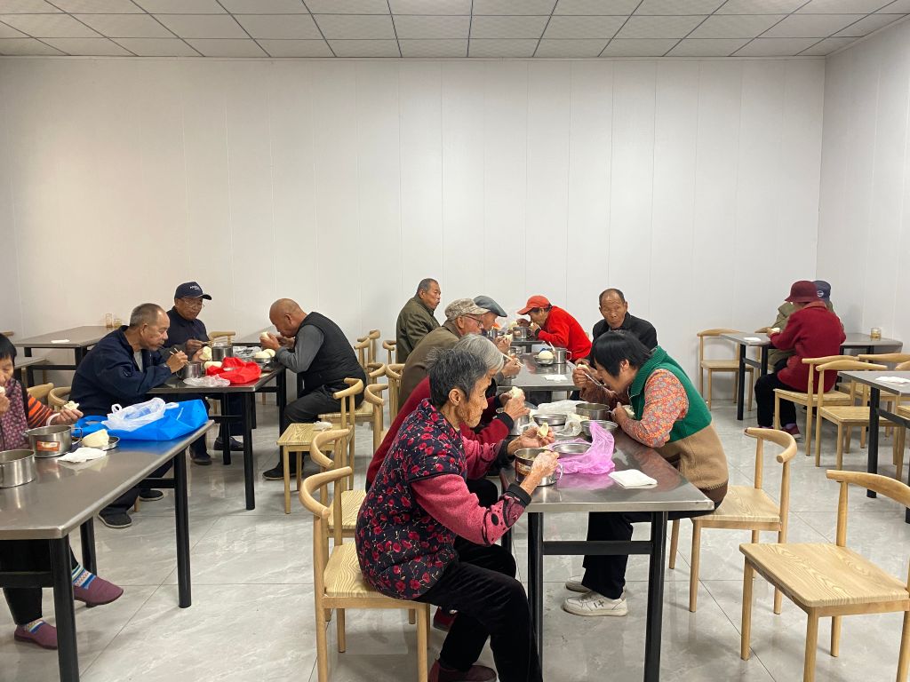 一大早,志愿者带着食材前往幸福院,大家一起搬下食材为老人做起了饭。社工积极参与,与志愿者分工合作,默契配合,有的洗菜、有的切菜、有的切肉,每一项助餐准备工作都干得井井有条。过程中,社工和志愿者互相分享平时煮饭以及参与志愿服务的经验,加深了解。上午11点,朱各务村幸福院已经是饭香扑鼻,老人们翘首以盼,等待今天的饭菜出锅。在社工的引导下老人们有序入座,丰盛的菜肴陆续上桌,老人们津津有味的吃了起来。