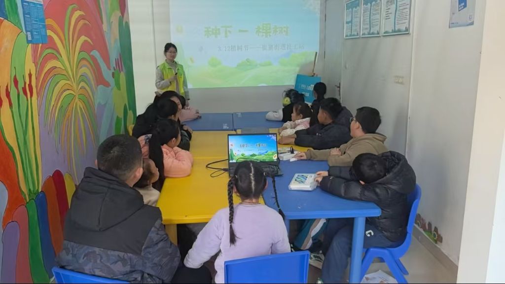 活动伊始,社工通过精心制作的PPT,以生动形象的图片和通俗易懂的语言,向孩子们娓娓道来植树节的起源及其重要意义。孩子们聚精会神地聆听,逐渐认识到植树造林不仅是美化环境的手段,更是保护地球生态的重要举措。在互动环节中,社工展示了各种经典树木的图片,引导孩子们分享自己认识的树木。孩子们踊跃发言,有的讲述了与树木相关的趣事,有的则分享了树木的特性、生长周期及其对环境的贡献。现场气氛热烈,充满了对自然的热爱与好奇。