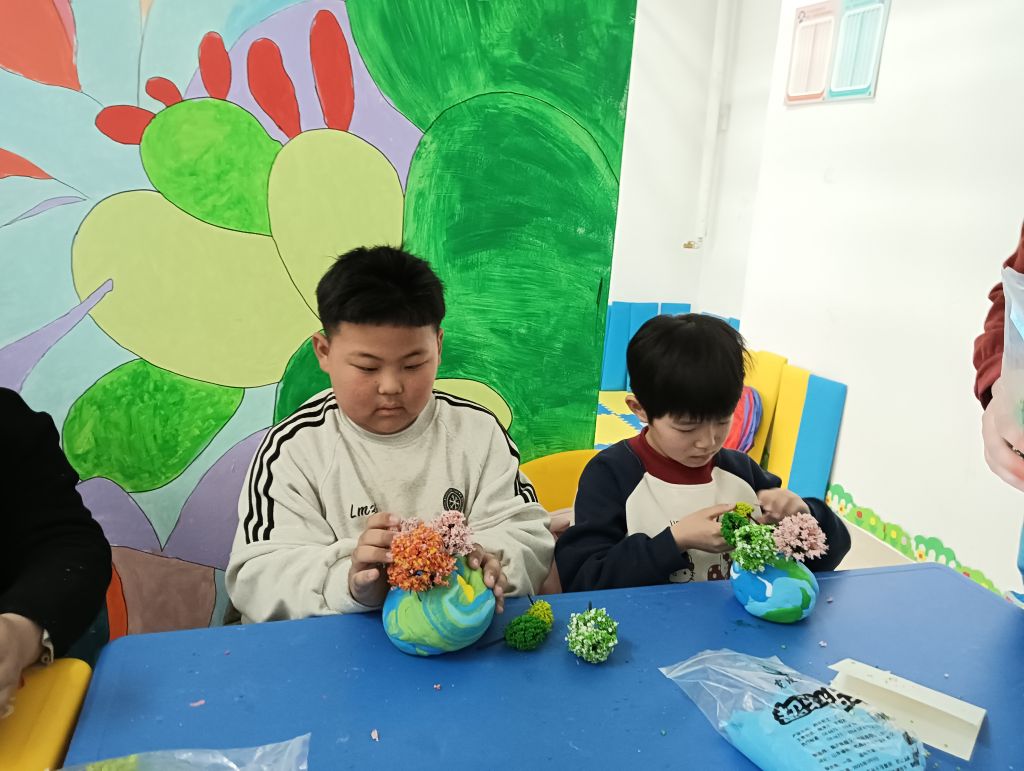 随后,活动进入了充满创意的手工制作环节。社工为孩子们准备了粘土和景观树等材料,指导他们制作以“树”为主题的手工作品。孩子们充分发挥想象力,用五彩斑斓的粘土塑造出形态各异的地球,再小心翼翼地将景观树点缀其上,寓意着为地球增添绿色生机。在制作过程中,孩子们相互协作,遇到困难时共同探讨解决办法,不仅提升了动手能力,还培养了团队合作精神。每一件作品都凝聚着孩子们对绿色未来的美好憧憬。