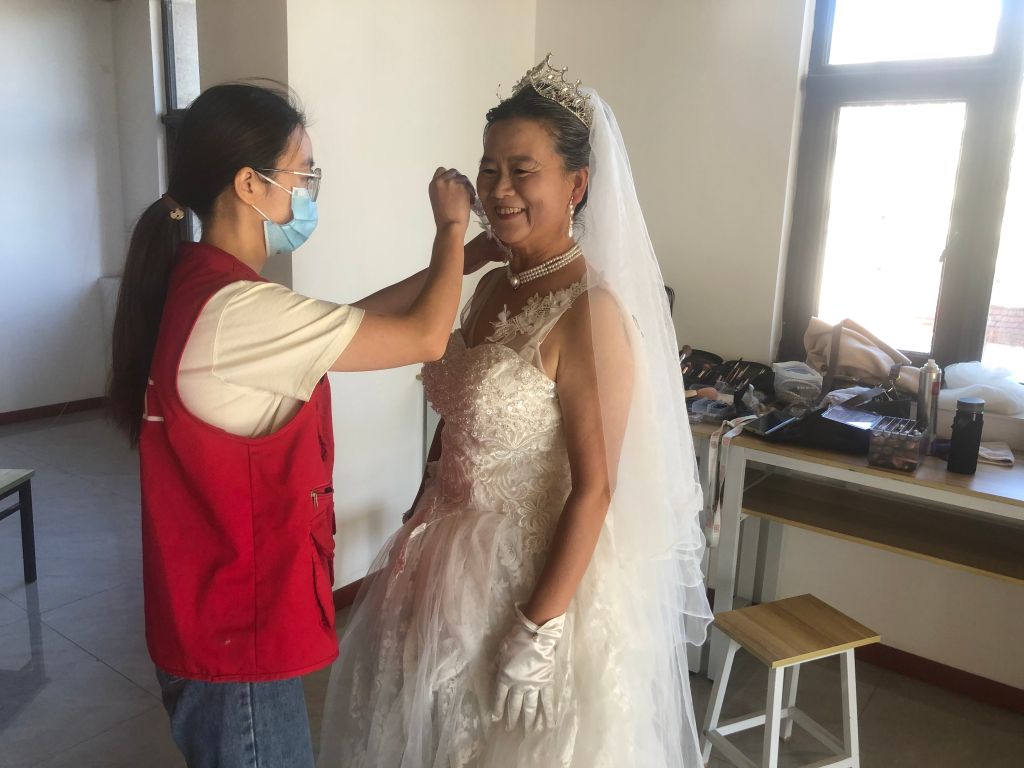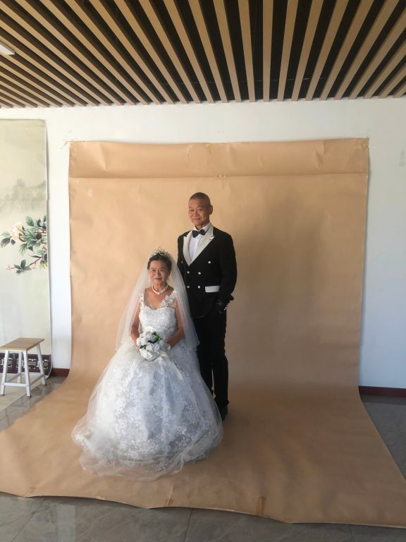 活动当天清晨,社工和志愿者们便早早地抵达现场,他们热情周到地引导老人们有序进入化妆室。在社工的悉心陪同下,老人们满怀欣喜地挑选着自己心仪的礼服。摄影棚内,“叔叔,请您再稍微向右侧一点,阿姨,请您笑得再开心点……”摄影师耐心地指导着,不断按下快门,为老人们调整动作,捕捉每一个珍贵的瞬间。随着闪光灯的频繁闪烁,幸福、感动、甜蜜的笑容被一一定格,整个现场洋溢着温馨而浪漫的氛围。