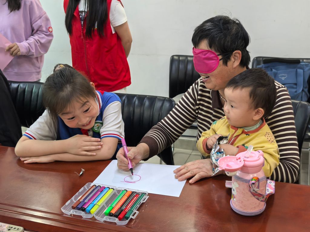 蒙眼画图游戏率先开场,现场气氛迅速被点燃。家长蒙上眼罩后,在孩子的引导下,手持画笔尝试画出脸的五官。视线受阻加上孩子指挥时急切懵懂的表达,有的五官位置奇奇怪怪,有的形状歪歪扭扭,现场笑声不断。在轻松诙谐的互动中,亲子间的默契也在慢慢增进。