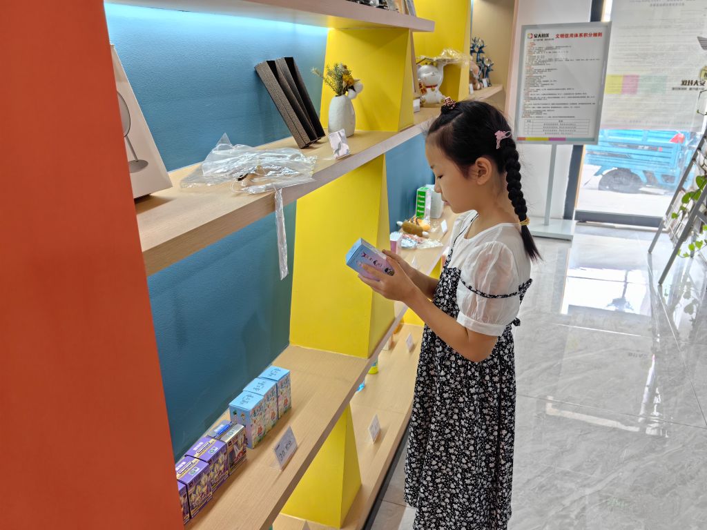 为了让居民直观地感受到这家新开业的“超市”,社工室将一面墙单独开辟出来,作为文明信用积分超市的主阵地。同时还梳理出涉及党员管理、公益美德、文明宣传、志愿服务等30余项居民商户可参与的社区治理项目,形成《文明信用积分细则》,把可兑换的商品和细则进行展示,实现项目运行机制的透明化和公开化。