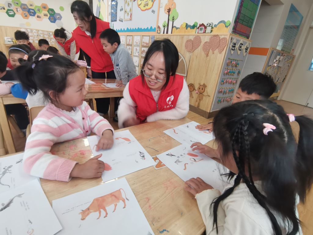 绘本阅读环节,志愿者选取了充满奇思妙想的《借尾巴》。志愿者用极富感染力的声音,配合灵动的表情和动作,将故事里小动物们借尾巴的有趣情节生动演绎。孩子们目不转睛,被深深吸引,随着故事的推进时而紧张,时而欢笑,沉浸在奇妙的动物世界中,极大地激发了他们对阅读的热爱。