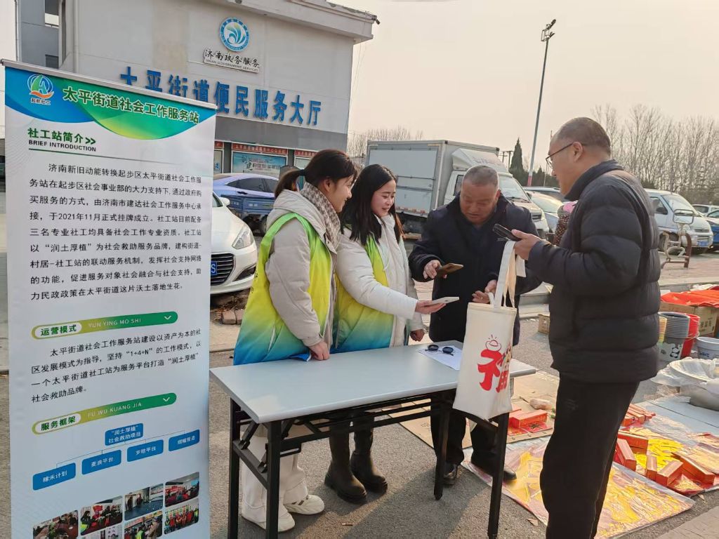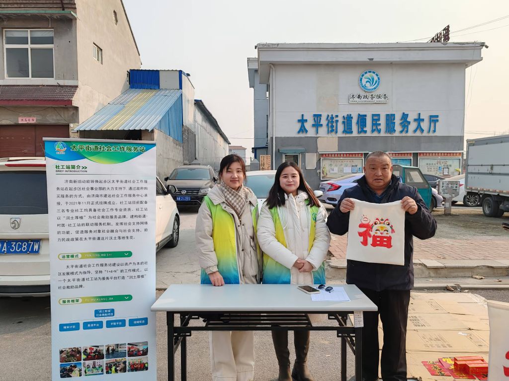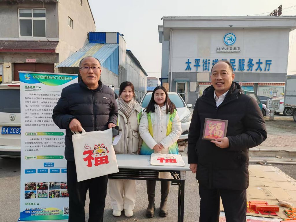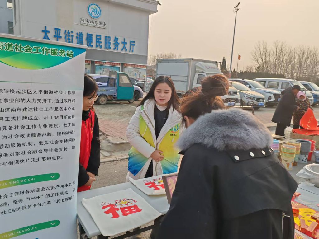 新春佳节将至,济南新旧动能转换起步区太平街道社工站积极践行社会责任,在1月23日于太平街道集市举办了一场慈善集市义卖活动。此次活动聚焦于低保户和特困人员,通过义卖他们精心制作的手工福字帆布包、福字相框作品,为需要帮助的人群汇聚爱心力量。