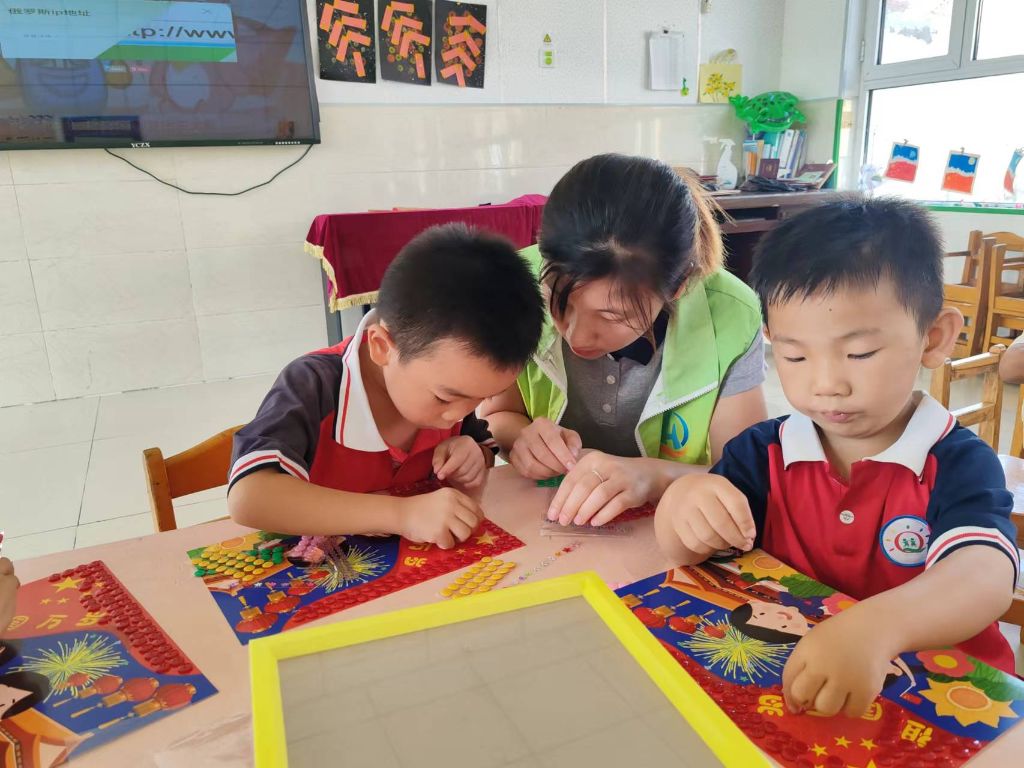 “老师,我要在纽扣画上写上祝祖国妈妈生日快乐”,其中一位小朋友高兴地说道。经过孩子们不懈的努力,一幅幅画纽扣画就做好了,大家争相展示着自己的作品,每个人脸上都洋溢着自信的笑容。最后孩子们手举五星红旗在“起来!不愿做奴隶的人们!把我们的血肉,筑成我们新的长城...”的歌声中结束了活动。
